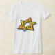 Para você, comemoração de hanukkah, esta design é perfeita. É uma estrela do Hanukkah. A design tem a estrela em ângulo, com uma parte da estrela de cor laranja e a outra amarela. É um olhar muito eficaz. Este design de estrela do Hanukkah parece excelente nesta t-shirt feminina. Perfeito para si mesmo ou como presente