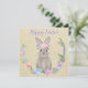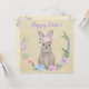 This sweet card features a beautiful painted bunny rabbit, wearing flowers on her head, sitting inside a wreath. Typography on the front says Happy Easter in lavender with a white edge. The bunny is set against a faux linen pale yellow background. On the reverse side of the card it says "Always remember you're somebunny special. Happy Easter". More pastel colored watercolor flowers are on the back. The text on back is customizable so you can put a different greeting on it if you wish, by using the "Personalize this template" link on the right.