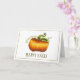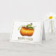 Cartão clássico perfeito para enviar saudações de outono! O cartão apresenta uma abóbora laranja clara e esbranquiçada com caule e folhas verdes. A mensagem "Happy Fall" está inscrita em tons de ouro abaixo; uma delicada borda de ouro enquadra o design. Vazio no dentro.