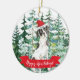 Um Enfeites de natal de Cachorro Ponteiro em Inglês, com data bonita, em um plano de fundo de pinheiros e pinheiros, com a mensagem de feriado "Feliz Howlidays". Visite nosso compro para ver uma grande variedade de pães de cão