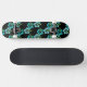 Este skate é mostrado com uma cor preta de fundo com um impressão de flores tropicais azul-lacaias.