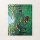 Henri Rousseau, quebra-cabeça dos trópicos. Pintura a óleo na canvas por volta de 1905-1910. O artista francês Henri Rousseau pintou dezenas de cenas tropicais ao longo de sua carreira. Os trópicos são uma de suas muitas pinturas encantadoras de macacos. Como a Paisagem Exótica, a obra apresenta uma família de monges sentados em um pomar de laranja. As árvores acima são pesadas com fruta madura. Alguns pequenos macacos subem nos galhos, enquanto dois macacos maiores se sentam na espessa grama tropical compartilhando uma laranja. Um belo presente para fãs de Henri Rousseau, impressionismo poste, primitivismo, pinturas tropicais e arte francesa.