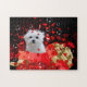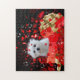 Este é meu bonitinho Cachorro Maltês Hermes. Ele está sentado em uma grande caixa de presentes com um chá de corações vermelhos!