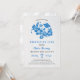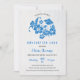 Convite festivo e de Festa de formatura de moda perfeito para um evento Luau ou Summer. A design apresenta um motivo com hibisco, folhas, palmeiras e um boné de formatura com padrão de brilho azul. O fundo tem uma textura de madeira branca macia para um toque rústico.