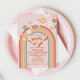 Groovy One! Retro inspirou o convite de aniversário do arco-íris com fontes e cores do estilo 70.