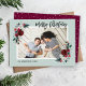 cartões com fotos de feriado personalizados com barato simples para personalização. Este design festivo apresenta uma elegante borda floral de aquarela em cores vermelha, verde e burgundy sobre fundo de menta. O texto diz "Feliz Natal" numa letra moderna de escrita de caligrafia. Personalize-o com suas fotos, nome, ano ou outro texto personalizado. O verso tem espaço para fotos ou texto adicionais. Use as ferramentas de design para editar o texto, adicionar mais fotos e criar um design de cartão com fotos de feriado exclusivo.