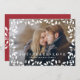 Um simples e elegante cartão com fotos de férias enquadra sua foto horizontal com uma borda de folhas brancas e bagas. Personalize com um Natal ou cartões de natal (mostrado com "alegria, paz, amor") e seus nomes embaixo. Adicione uma foto adicional ao fundo de um fundo vermelho de amora festiva com uma faixa de folhagem sagrada correspondente.