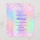 Um convite de festas de Quinceañera feminino e feminino. Na frente: Um arco-íris, fundo holográfico colorido em roxo, rosa, verde-menta. Decorado com confete cor-de-rosa penteado. Personalize e adicione um nome e detalhes da parte. O nome é escrito com um script de estilo manuscrito, letras cor roxa. 1 folha = 1 convite impresso de borda a borda.