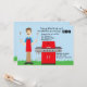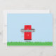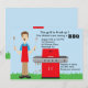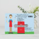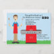 Este é o convite perfeito para começar aquele churrasco da maneira certa. Este convite tem um fundo de céu azul claro com grama ao longo da parte inferior. Há um homem em pé com utensílios de cozinha em cada mão e ele está usando um avental de cozinha vermelho. Há uma churrasqueira a gás vermelha ao lado dele. Adorável para qualquer festa!