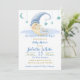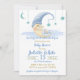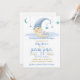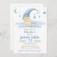 Este chá de fraldas é simplesmente lindo para enviar a todos os seus amigos e familiares anunciando as informações sobre o seu evento especial de chá de fraldas que está para vir. Desenho: um bonitinho cartoon na lua segurando o bebê dormindo, estrelas azul bebê e pó azul de fada.
