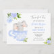 Está na hora do chá com a mamãe! Esta festa de chá divertida e o convite para o chá de fraldas temático do elefante apresenta um elefante aquarela sentado em uma equipe azul com uma borda de flores azuis e verde. Personalize com suas informações ou clique em "Clique para personalizar mais" para editar estilos de fonte, tamanho e cores.