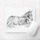 Uma ilustração/desenho de um cavalo jovem deitado no chão, a preto e branco (caneta esferográfica), que apenas acorda do seu cochilo. Pelo artista Robin Hewitt.