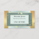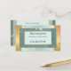 Cartão de visita profissional com um design moderno com folhas giratórias em fundo geométrico verde e dourado. Uma cartão de visita para um artista de maquiagem, um belicista ou um massagista.