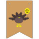 Este fantástico bunting festivo mostra um desenho engraçado de um peru com grandes olhos pretos, um pequeno bico amarelo e penas de cauda grudadas. Os pés estão voltados em direções opostas, fazer o peru parece desajeitado. O peru está segurando um balão amarelo com um dentro de mensagem que diz "é hora do peru". Esta é uma design de festa de ação de graças divertida.