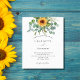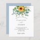 Um fundo branco na frente decorado com girassóis, eucalipto verde. Personalize e adicione seus nomes e detalhes da festa. Bacl: fundo azul empoeirado.