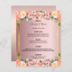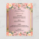 Um cartão de cardápio do estilo boêmico elegante. Rosas cor-de-rosa, de cor aquosa, como decoração. Modelos para seus nomes, data e menu de casamento. Uma falso estrutura dourada e uma cor metálica de fundo rosa poeirenta cúbica. Letras pretas coloridas. Traseira: fundo rosa metálico falso empoeirado.