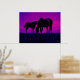 Cavalo e inchado na Pop de Arte Sunset. Belos cavalos com um pôr do sol colorido no fundo. Silhuetas de cavalos em fundo solar.