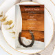 Personalize o encantador Menu de Casamento Ocidental de Ferradura e Satin Country com os detalhes da refeição que você servirá no almoço de chá de panela, ensaie janto ou recepção de casamento adicionando a salada ou o primeiro curso, o primeiro curso ou o segundo curso e a sobremesa ou o terceiro curso. Personalize-o com os nomes da noiva e do noivo, localização do local e data do evento. Este cardápio de casamento do tema equino rústico apresenta uma fotografia escura de ferradura enferrujada e cebola branca com um fundo de madeira de cascata castanha. Perfeito para o casal que planejou uma fazenda rural casual, mas clássica, barninho rústico, rancho, equestre, cavalo ou tema de casamento ocidental.