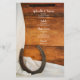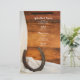 Personalize o menu de casamento ocidental do País Santa e da ferradura chica rústica com os detalhes da refeição que você servirá no seu almoço informal de chá de panela estilo fazenda, janto de ensaio ou recepção de casamento quando você adicionar a salada ou primeiro curso, entrada ou segundo curso e sobremesa ou terceiro curso. Este encantador menu de casamento do tema rancho personalizado apresenta uma fotografia digitalmente melhorada de uma ferradura empoeirada e cebola branca e um fundo de madeira de celeiro com intempéries. Perfeito para o casal que planejou uma fazenda rural casual, mas clássica, festas de celeiro, rancho, equestre, cavalo ou tema de casamento ocidental.