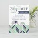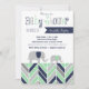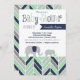 Este convite fresco, moderno do chá de fraldas caracteriza um teste padrão multi-colorido geométrico da viga nos azuis marinhos, no verde da hortelã, e nos tons das cinzas. Igualmente inclui um toque de irrisório com os dois elefantes do bebê que marcham avante. Aperfeiçoe para um chá de fraldas do menino.