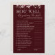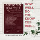 Celebrate the bride-to-be with this elegant How Well Do You Know the Bride bridal shower game. Designed in rich burgundy tones with romantic floral accents, this fun and interactive game lets guests test how well they know the bride. Perfect for bridal showers, bachelorette parties, engagement celebrations, and wedding events. A beautiful keepsake and a great ice-breaker that coordinates perfectly with floral and burgundy bridal shower décor.