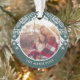O ornamento festivo de fotos de Natal apresenta uma foto favorita em cada lado, cercada por um padrão de suéter de férias em verde e branco de floresta. Personalize com sua legenda personalizada; mostrada com seu nome de família e o ano.