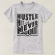 Camisas de beisebol / softball, disponíveis em estilos para homens, mulheres e crianças. O texto diz: Hustle, Hit And Nunca Sair, com o ícone cruzado de tacos de beisebol e softball.