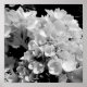 Impressão de fotografia floral quadrada, a preto e branco, para a casa. As pétalas de hydrangea são brancas contra o fundo preto.