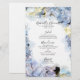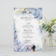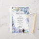 Personalize o elegante Menu de Casamento de Aquarela Azul Hydrangea Flowers Watercolor com os detalhes da refeição que você servirá no seu bonito jardim, tema inspiração, almoço de chá de panela, festa de noivado, brunch de casamento, janto de ensaio ou recepção adicionando a salada ou primeiro curso, entrada ou segundo curso e sobremesa ou terceiro curso. Personalize-o com os nomes da noiva e noiva, localização do local e data da cerimônia do casamento. Este clássico cardápio personalizado de casamento florescente apresenta uma fotografia floral colorido digitalmente pintada de cor d'água, de pétalas floridas de flor azul claro, enfeitando os cantos com fundo branco.
