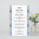 Hydrangea azul claro floresce menu de casamento personalizado com texto preto, impresso e iniciais monograma no topo. Um painel branco sobre flores bonito e hipórbicas no fundo. O papel do barato tem 5 x 8 polegadas. Entre em contato conosco com alterações ou solicitações de cor/design.