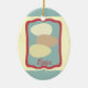 Retrai o cozinhar do café da manhã ou série de panificação Os enfeites da árvore de Natal para decoração saborosa! Este é um trio de ovos brancos e marrons em um fundo decorativo vermelho e azul.