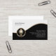 Este cartão de visita de treinador vocal apresenta segmentos preto e branco separados por uma fita de ouro ondulada. Um ícone elegante de ouro de um microfone está no lado inferior esquerdo da design, que é geralmente adequado para negócios ou profissões relacionadas a música, baixo, assalto, baixo guitarrista, músico, banda, entretenimento, temas de rock.