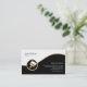 Este cartão de visita de pintor apresenta segmentos em preto e branco separados por uma fita de ouro ondulada. Um elegante ícone de ouro de uma pincel de tinta está no lado inferior esquerdo da design, que é geralmente adequado para empresas ou profissões relacionadas à construção, empreiteiro, reparo em casa, reparos, trabalhador, trabalhador qualificado, mão de obra qualificada, temas de habilidades comerciais.