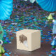 Um desenho de uma caixa de papelão de homem velho com barba branca e bigode. A caixa tem poeira, arredores, sol esmaecendo, água danificada, curvas, marcadores, tudo que o faz parecer velho. Ele também tem uma bengala com um topo curvo se inclinando contra ele. Uma caixa muito distinta.