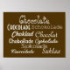 Ei, você tem chocolate na sua poster! Na verdade, com estas línguas de poster de Chocolate, você terá chocolate em inglês, português, espanhol, romeno, holandês, sueco, francês, dinamarquês, polonês, norueguês, italiano e finlandês na sua poster! Esta poster de chocolate marrom apresenta escrevendo branco em uma variedade de fontes que lê, "Chocolate Chocolade Schokolade Chokolade Chokolade Czekolada Sjokolade Cioccolato Suklaa." Mmmm... Chocolate.