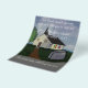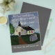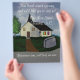 Desenho digital de uma pequena igreja rural, céu azul claro, uma árvore na paisagem de grama verde.
