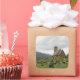 Um autocolante quadrado de uma igreja de barcos de madeira com túmulos e túmulos num cemitério na borda de um fiorde entre as montanhas de Gaupne, Sogn og Fjordane, na Noruega.