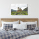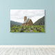 Telas de impressão de uma igreja de barbatanas de madeira com túmulos e túmulos num cemitério na borda de um fiorde entre as montanhas de Gaupne, Sogn og Fjordane, na Noruega.