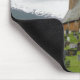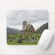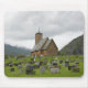 Mousepad com uma igreja de madeira do stave com lápides e sepulturas em um cemitério na borda de um fiorde entre as montanhas em Gaupne, og Fjordane de Sogn em Noruega.