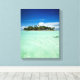 Tela vertical impressa de uma ilha desértica ou de uma aventura desabitada com palmeiras e um céu azul escuro na água turquesa de uma lagoa no arquipélago do Pacífico Polinésia Francesa