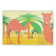 Esta região apresenta 2 camelos no deserto perto de algumas palmeiras.