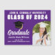 Este ímã de foto personalizado moderno branco e roxo para graduados apresenta sua fotografia de graduação ao lado de uma tipografia branca elegante do nome da sua faculdade para a turma de 2026. Personalize com o ano de sua graduação sob o elegante texto manuscrito preto e o chapéu de graduação preto para um cartão magnético de anúncio de graduação excelente.