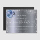 Uma placa de Imã salve a data giratória e de tendência para uma festa de aniversário 50th (ou qualquer idade). Um fundo metálico de aparência prateada e obscura, decorado com pó falso prateado e flores azuis. Personalize e adicione uma data e nome/idade. O texto: Salvar a Data é gravado com um script de estilo com letra de tendência grande.