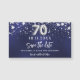Uma Imã salve a data moderna e elegante para uma festa de aniversário 70. Um fundo azul marinho decorado com estrelas de falso prata. Personalize e adicione uma data e um nome. A cor azul é irregular. O texto: Salvar a Data é gravado com um script de estilo com letra de tendência grande.