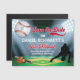 Esta Imã salve a data divertida e esportiva do Bar de Baseball Mitzvah apresenta um estádio de beisebol noturno com um diamante verde e marrom de baseball com luzes brilhantes brilhando na silhueta negra de um jogador de beisebol se curvando para pegar uma bola no chão. Um beisebol branco e vermelho com uma estrela judia azul-clara de David está no canto superior esquerdo com um esportivo vermelho e branco olhando Salvar o texto Data para a direita da bola com uma cauda que cai sob a palavra Data.