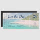 Um cartão de embarque de avião praia destino carta de imã salve a data de casamento com um litoral arenoso e água azul-oceânica azul-turquesa e um exuberante bosque de palmeiras-tropicais. Use a Ferramenta de Editor de Modelo de Design para sair avançado do design, como mudar a cor do texto, a fonte e o posicionamento, o plano de fundo da placa e a cor do avião.