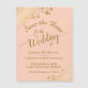 Este belo cartão magnético vai deixar seus amigos e família saberem salvar a data do seu próximo casamento. O belo apresenta um fundo cor de pêssego, cor de laranja claro ou de coral, uma caligrafia dourada e ornamentados de folhas e espirais nos cantos. Uma maneira bonita de deixar seus amigos e família saberem sobre seu próximo casamento.