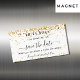 Uma cinta e uma tendência Salve a placa magnética Data para uma festa de aniversário (ou qualquer idade) de 30. Um fundo na moda branco decorado com faíscas douradas. O texto: Salvar a Data é gravado com um script de estilo com letra de tendência grande.