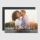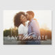 Um simples mas elegante cartão magnético de data para anunciar o seu noivado e o próximo casamento. A foto horizontal do solteiro apresenta texto branco na parte inferior com bastante espaço para nomes e detalhes do grande dia.