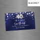 Uma Imã salve a data moderna e elegante para um aniversário de 40 anos. Um fundo azul marinho decorado com estrelas de falso prata. Personalize e adicione uma data e um nome. A cor azul é irregular. O texto: Salvar a Data é gravado com um script de estilo com letra de tendência grande.